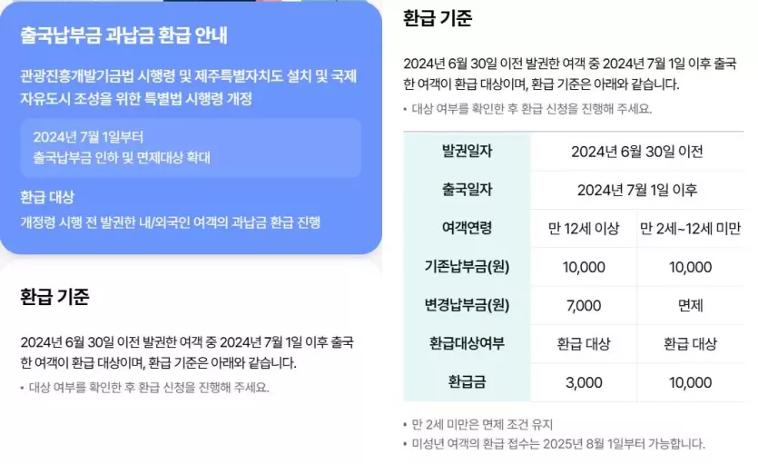 2024년 7월 1일 이후 출국한 성인은 3,000원을 환급받을 수 있으며, 만 12세 미만 어린이는 10,000원을 환급받을 수 있습니다(2025년 8월 1일부터 신청 가능).