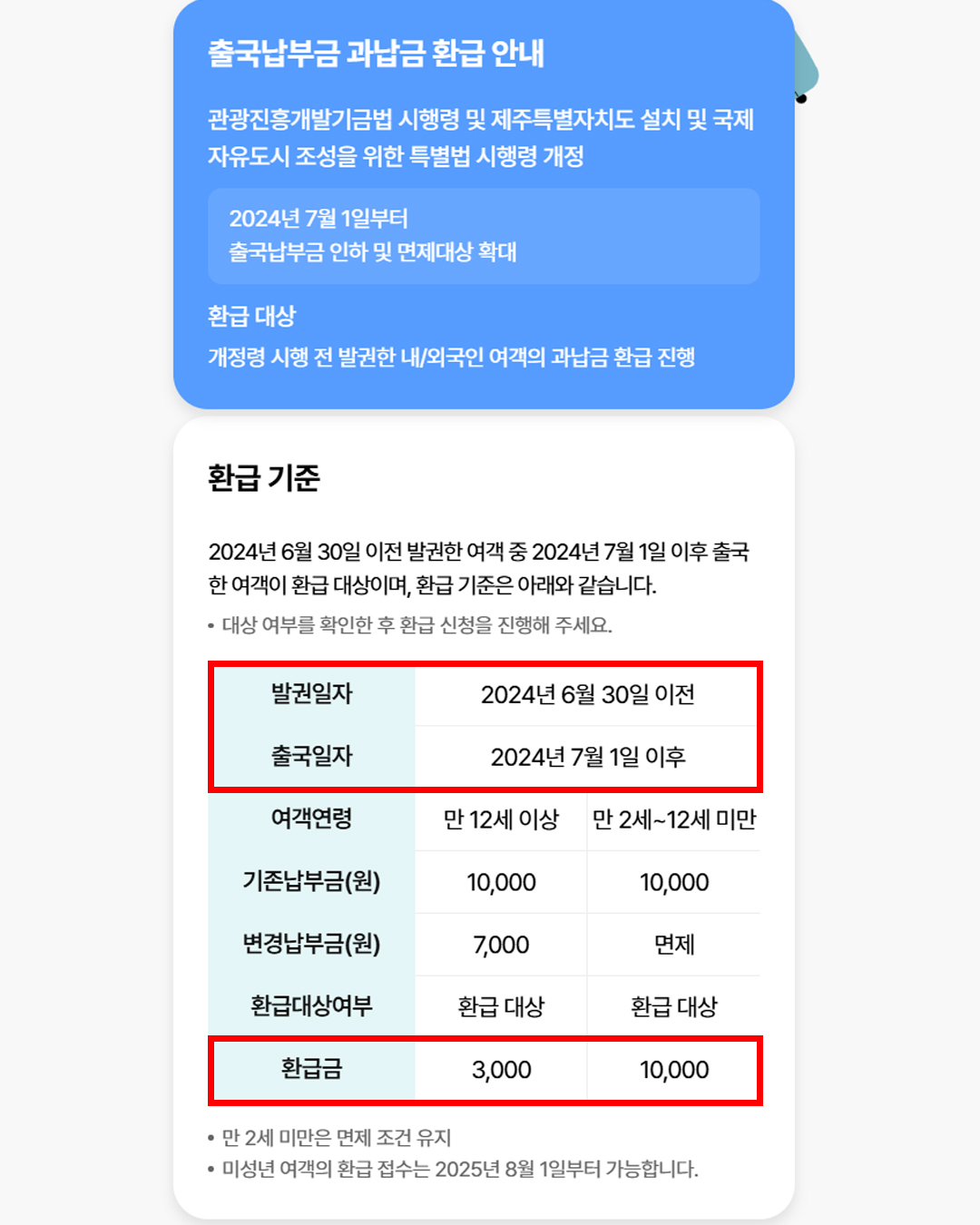 2024년 7월 1일 이후 출국한 성인은 3,000원을 환급받을 수 있으며, 만 12세 미만 어린이는 10,000원을 환급받을 수 있습니다(2025년 8월 1일부터 신청 가능).