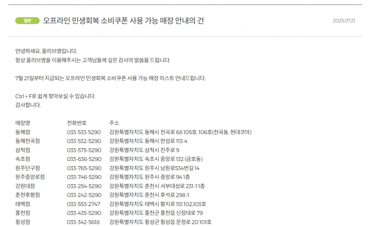 A: 소비쿠폰은 올리브영의 일부 가맹점에서만 사용 가능합니다. 사용 전에 반드시 매장에 문의해주세요.
