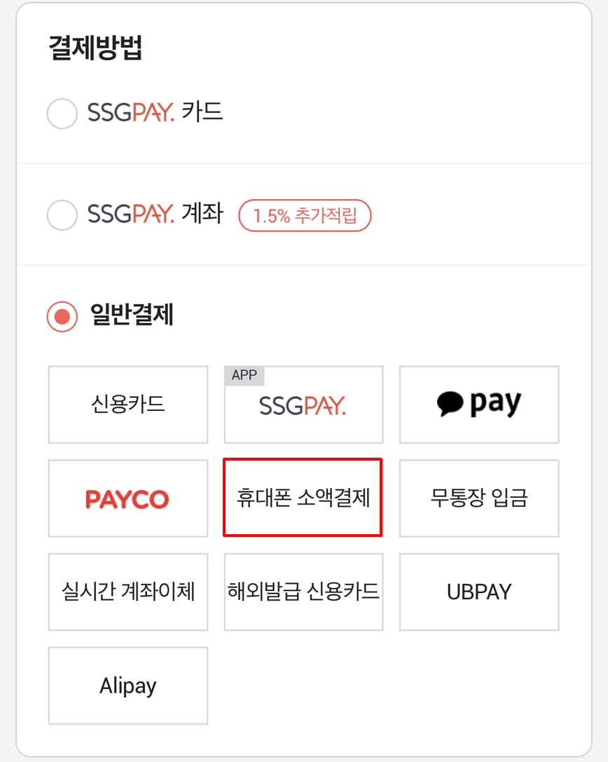 1️⃣ 결제 페이지에서 ‘휴대폰 결제’ 선택