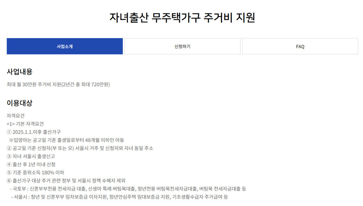 서울시는 2025년 저출산 문제를 해결하고, 무주택 가구의 주거 부담을 완화하기 위해 자녀를 출산한 가구에 대해 주거비를 최대 36개월 간 지원하는 제도를 운영 중입니다.